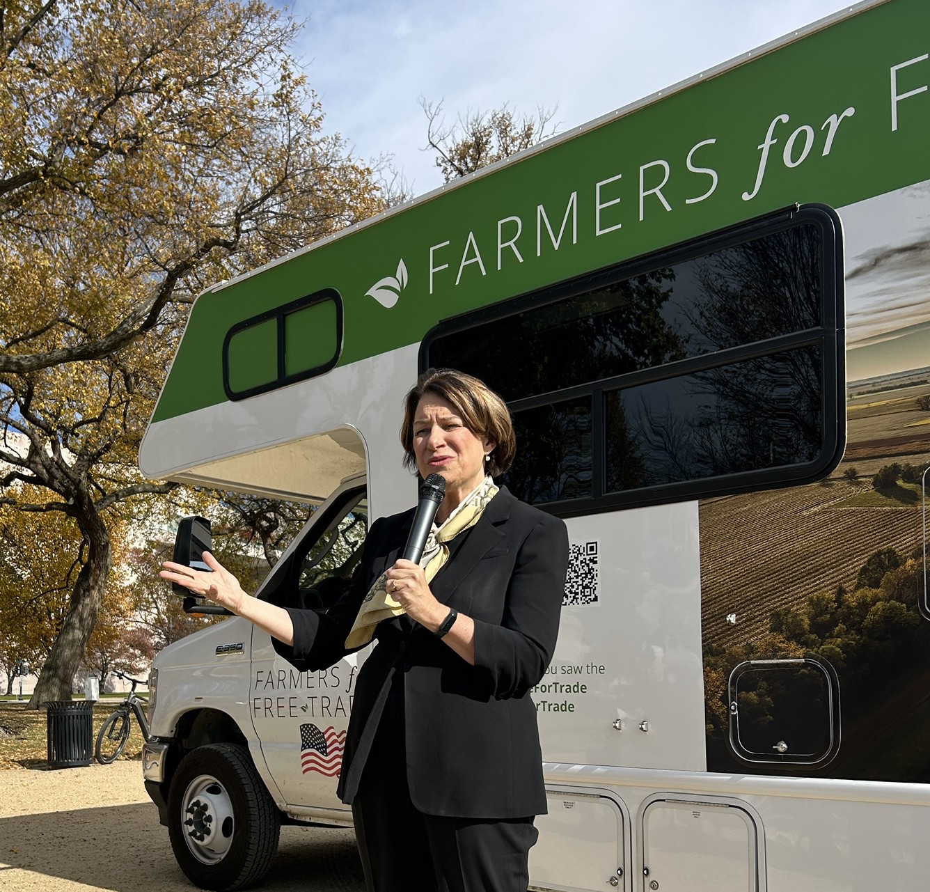 Sen. Amy Klobuchar (D-MN) spoke out against the Trump administration’s tariff policy during the final stop of the Farmers for Free Trade Motorcade for Trade on the National Mall Tuesday.