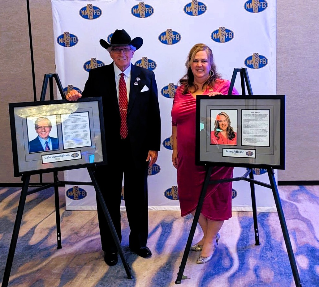 Veteran broadcasters Janet Adkison and Gale Cunningham were honored on Thursday evening as 2025 NAFB Hall of Fame inductees. Adkison, a longtime broadcaster who is now director of public affairs and advocacy for the Missouri Farm Bureau, served as NAFB president in 2014. Cunningham, ag director for the Central Illinois Multimedia Group, was the association’s president in 2021.· Herb Plambeck Award, recognizing top creative farm broadcast advertising, went to Mick Kjar, AgNews 890 (single ad category) for the North Dakota Livestock Alliance Annual Summit; and Susan Littlefield, American Ag Network (series), for Farming Minds: Mental Health in Agriculture.